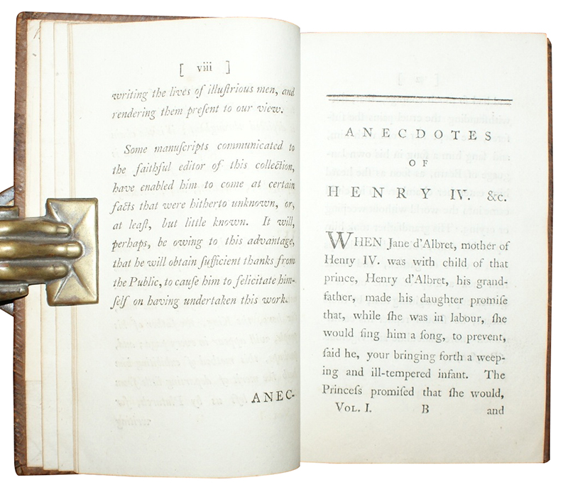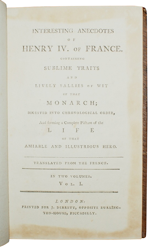 The second English edition of Louis-Laurent Prault's L'esprit D'Henri IV (Paris, 1770), extended from the single-volume English edition of 1787, printed for Cadell. Henry. Both are uncommon, with ESTC locating copies at only three locations within the British Isles (BL, Cambridge and NLI) and four elsewhere.